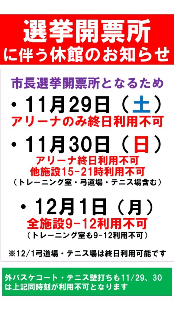 ★11/29(土)~12/1(月)上尾市長選挙開票所開設に伴う休館について★ 2025.11.28 11月29日(土)~12月1日(月)は開票所開設に伴う休館がございますので、ご確認をよろしくお願いいたします。(※休館中のトレーニング室新規講習会もございません)