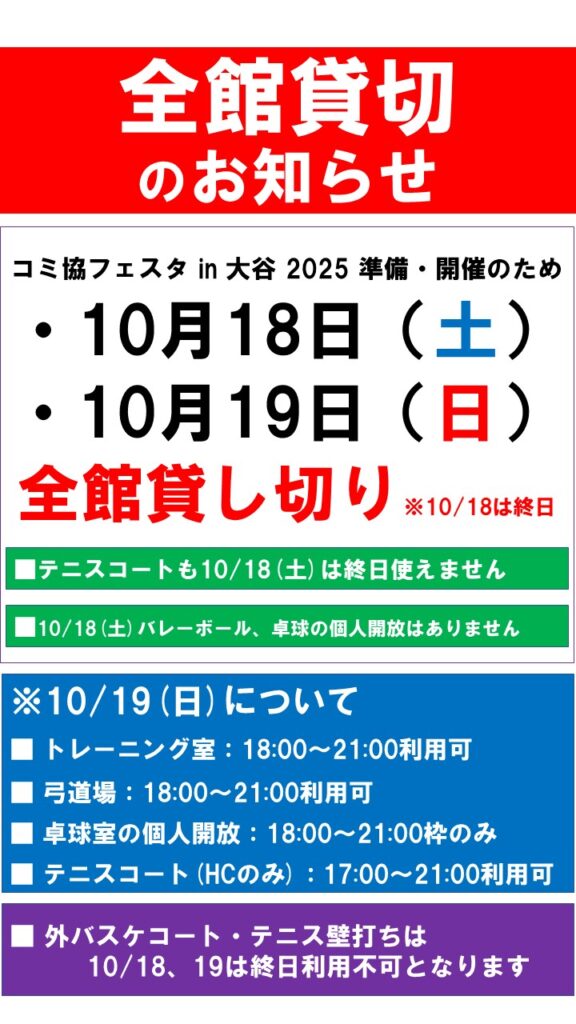 10/18(土)、10/19(日)は例年開催の「大谷地区コミ協まつり2025」の準備・開催日の為、市民体育館の利用は、大幅に制限されますのでご注意ください