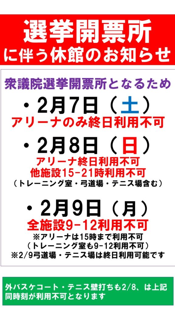 2月7日(土)~2月9日(月)は開票所開設に伴う休館がございますので、ご確認をよろしくお願いいたします。(※休館中のトレーニング室新規講習会もございません)